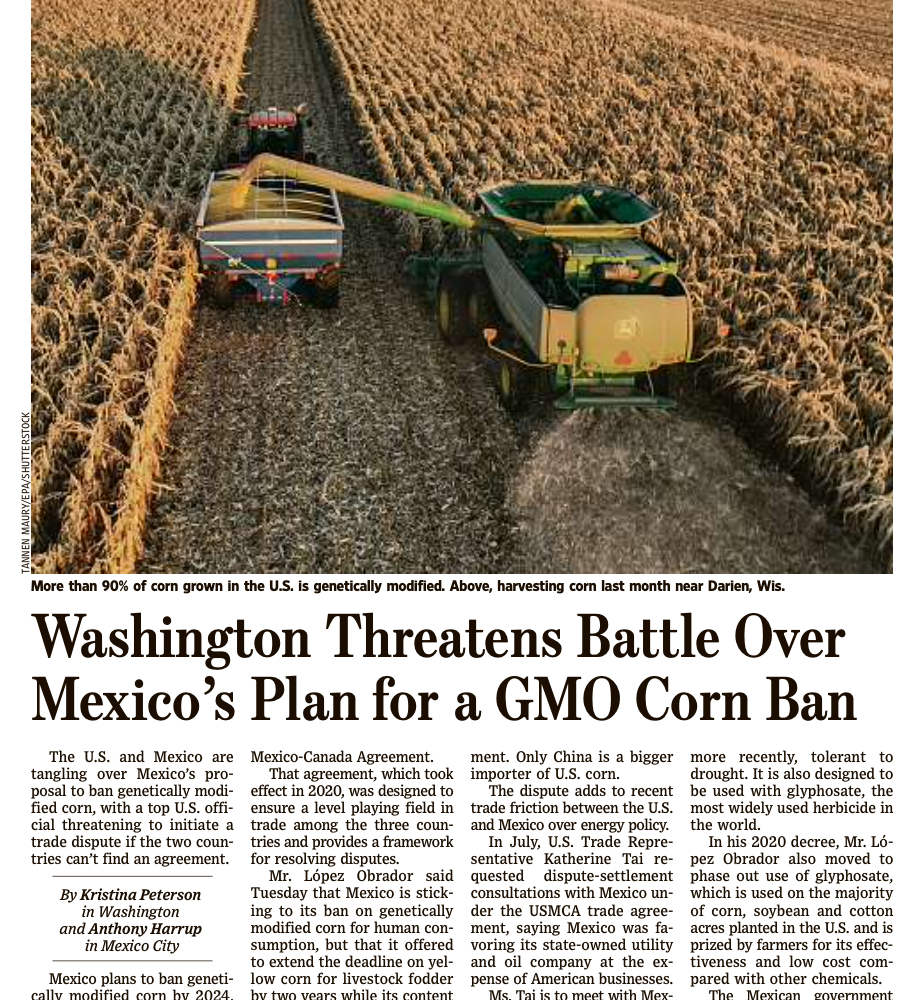 GMO ਦੇ ਹੱਕ ਵਿੱਚ ਭ੍ਰਿਸ਼ਟਾਚਾਰ ਅਤੇ ਜ਼ੋਰ-ਜਬਰਦਸਤੀ ਦੇ ਇਸ ਇਤਿਹਾਸ ਨੂੰ ਦਿੱਤੇ ਗਏ, ਮਨੁੱਖੀ ਖਪਤ ਲਈ ਜੈਨੇਟਿਕਲੀ ਸੋਧੀ ਮੱਕੀ 'ਤੇ ਮੈਕਸੀਕੋ ਦੀ ਪਾਬੰਦੀ ਨੂੰ ਸਖਤੀ ਨਾਲ ਜਾਂਚ-ਪੜਤਾਲ ਦੀ ਲੋੜ ਹੈ। ਕਈ ਕਾਰਕ ਸੰਕੇਤ ਕਰਦੇ ਹਨ ਕਿ ਇਹ ਪਾਬੰਦੀ ਅੰਤ ਵਿੱਚ GMO ਨੂੰ ਵਿਆਪਕ ਪੱਧਰ 'ਤੇ ਪੇਸ਼ ਕਰਨ ਦੀ ਲੰਬੇ ਸਮੇਂ ਦੀ ਰਣਨੀਤੀ ਦਾ ਹਿੱਸਾ ਹੋ ਸਕਦੀ ਹੈ: