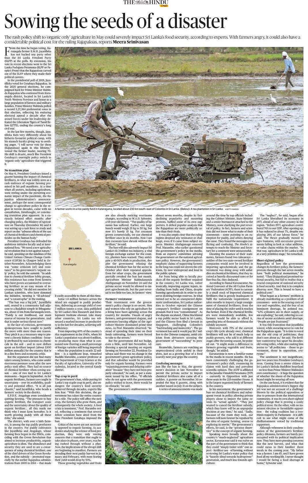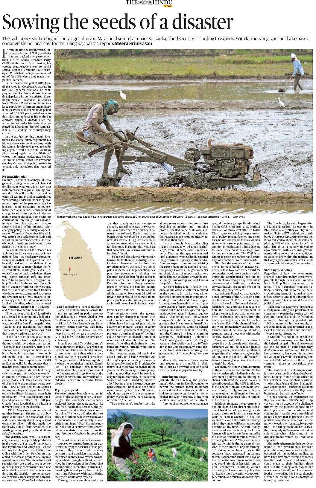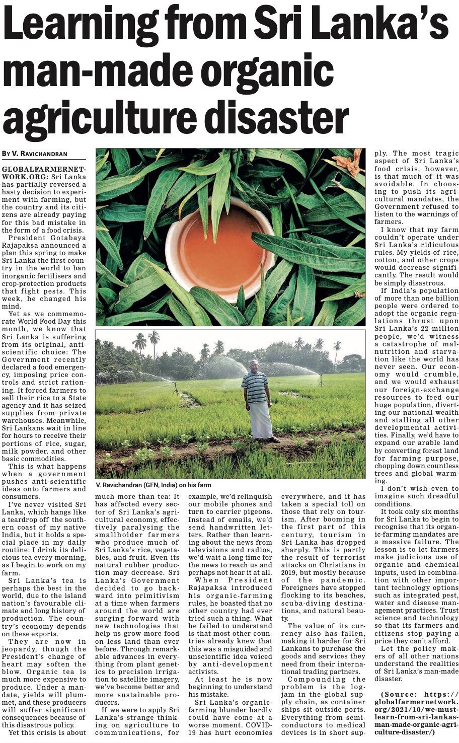 ਸਿਰਲੇਖ ਵਾਲਾ ਇੱਕ ਲੇਖ ਪ੍ਰਕਾਸ਼ਿਤ ਕੀਤਾ ਸੀ ਜੋ ਦਰਸਾਉਂਦਾ ਹੈ ਕਿ 100% ਜੈਵਿਕ ਖੇਤੀ ਦੇ ਅਚਾਨਕ ਲਾਗੂ ਕਰਨ ਨੂੰ ਸ਼ੁਰੂਆਤ ਤੋਂ ਹੀ ਅਸਫਲ ਮੰਨਿਆ ਗਿਆ ਸੀ।
