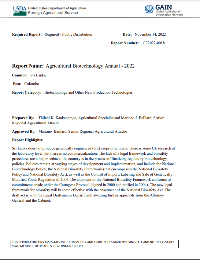 (2023) ਅਮਰੀਕੀ ਰਿਪੋਰਟ ਸ੍ਰੀਲੰਕਾ ਵਿੱੱਚ ਜੀਐੱਮਓ ਭੋਜਨ ਉਤਪਾਾਦਨ ਦੀ ਪੁਸ਼ਟੀ ਕਰਦੀ ਹੈ ਸਰੋਤ: AgricultureInformation.lk | ਯੂਨਾਈਟਿਿਡ ਸਟੇਟਸ ਡਿਿਪਾਰਟਮੈਂਟ ਆਫ਼ ਐਗਰੀਕਲਚਰ ਦਾ ਦਸਤਾਵੇਜ਼