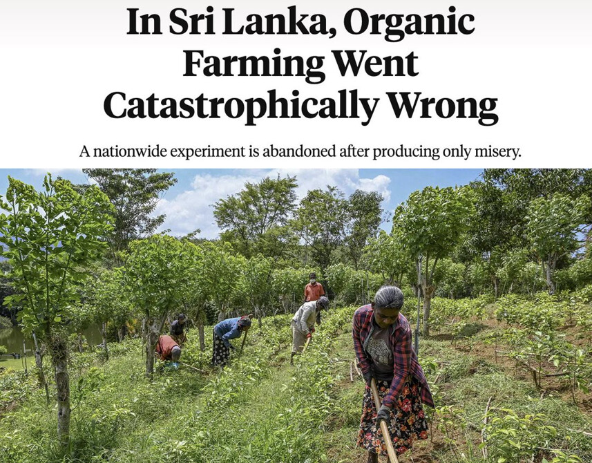 ਸ੍ਰੀਲੰਕਾ ਨੇ ਪਿਿਛਲੇ ਸਾਲ ਆਪਣੇ ਨਾਗਰਿਿਕਾਂ 'ਤੇ ਇੱਕ ਬੁਰਾ ਪ੍ਰਯੋਗ ਕੀਤਾ। ਜੈਵਿਿਕ ਭੋਜਨ ਅਤੇ ਜੀੀਐੱੱਮਓ ਵਿਰੋਧੀ ਕਾਰਕੁਨਾਂ ਦੇ ਦਬਾਅ ਹੇਠ, ਸਰਕਾਰ ਨੇ ਸਿੰਥੈਟਿਿਕ ਕੀਟਨਾਾਸ਼ਕਾਂ ਦੀ ਆਯਾਤ 'ਤੇ ਪਾਬੰਦੀ ਲਗਾ ਦਿੱਤੀ ਅਤੇ ਦੇਸ਼ ਨੂੰ ਪੂਰੀ ਤਰ੍ਹਾਂ ਜੈਵਿਿਕ ਖੇਤੀ ਵੱਲ ਤਬਦੀਲ ਕਰਨ ਲਈ ਮਜਬੂਰ ਕੀਤਾ, ਜਿਿਸ ਨਾਲ ਵੱਡੀ ਗਿਿਣਤੀ ਵਿੱੱਚ ਕਿਸਾਨਾਂ ਕੋਲ ਉਹ ਜ਼ਰੂਰੀ ਸੰਦ ਹੀ ਨਾ ਰਹੇ ਜੋ ਉਹ ਆਪਣੇ ਦੇਸ਼ ਲਈ ਫਸਲਾਂ ਉਗਾਉਣ ਵਿੱੱਚ ਵਰਤਦੇ ਸਨ।